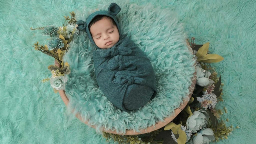 Wrapping is an essential skill for any photographer. The “Potato Sack” pose involves snugly swaddling the baby in a circular shape and sitting them upright (with hidden support). This is one of the most effective newborn photography poses for soothing a fussy or “touchy” baby who doesn’t want to be moved. The pressure of the wrap mimics the tight environment of the womb, often lulling the baby into a deep sleep.
