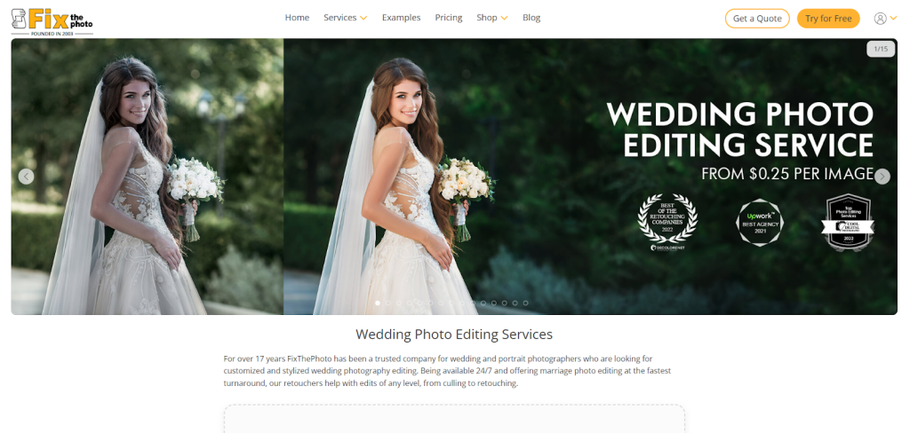 FixThePhoto is a well-known Wedding Photo Editing Company with a long history in the image editing industry. It appeals to photographers who want a recognizable brand and a wide range of editing services under one roof. Their wedding photo editing services include color correction, retouching, background cleanup, and creative enhancements.
